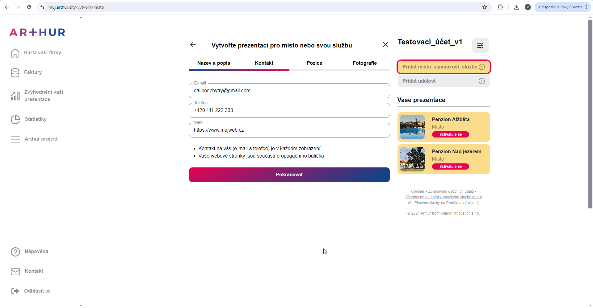 Zadejte E-mail, Telefon a web. Klikněte na Pokračovat.