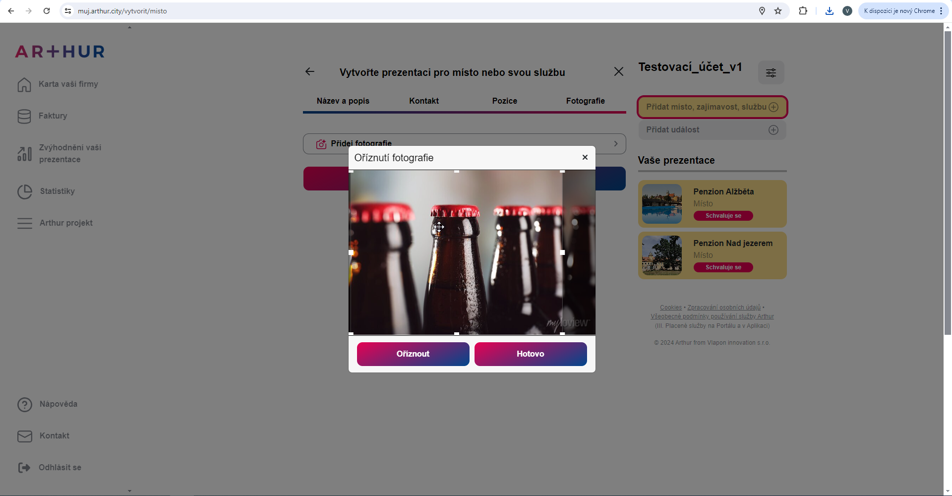 Klikněte na tlačítko Přidat fotografie. Můžete vložit jeden nebo více fotografií. Každou fotografii máte možnost oříznout. Pokud si nepřejete fotografii oříznout, klikněte na Hotovo.